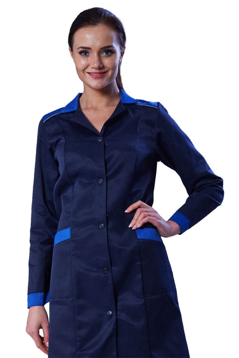 Халат с центральной бортовой застежкой на петли и пуговицы, со смещенным плечевым швом, воротник отложной. Полочки с вертикальными рельефами, с двумя нижними накладными карманами с наклонным входом. Боковые срезы карманов входят в боковые и рельефные швы.