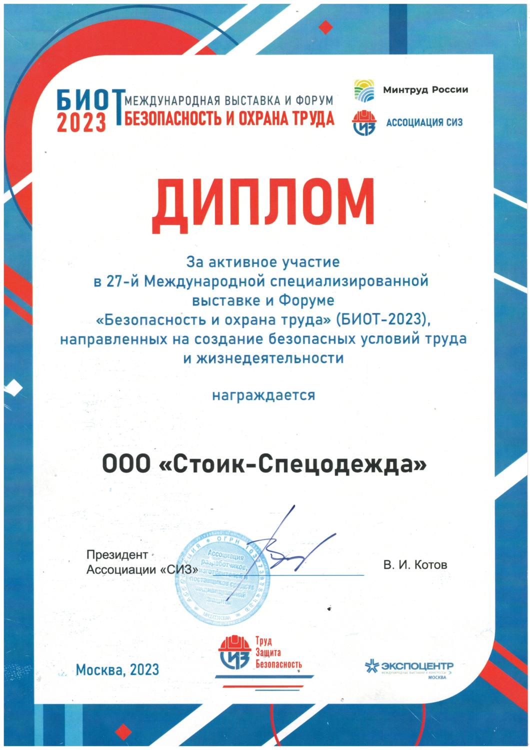 Диплом за активное участие в 27-й в международной специализированной выставке "Безопасность и охрана труда". БИОТ-2023